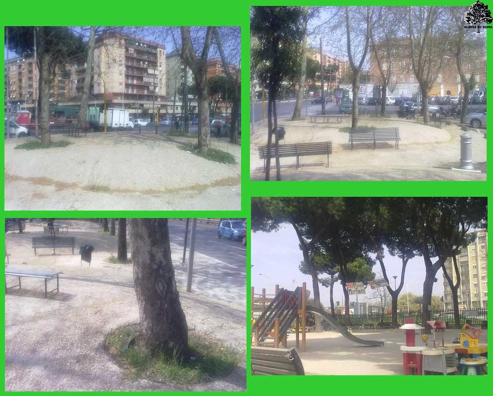 Giardini di cemento! Di recente, in diverse zone della città, alcuni giardini sono stati modificati con nuove aiuole, piante, marciapiedi e anche nuove pavimentazioni che non sono più a carattere erboso, con brecciolino o terra, ma in cemento. Bianco, ma pur sempre cemento. I motivi di tale scelta sono molteplici e non necessariamente deprecabili: la pavimentazione in cemento è certamente più duratura, sopporta meglio il passaggio di tante persone ogni giorno, facilita il percorso ad anziani, diversamente abili, madri con passeggini o chiunque abbia difficoltà alla deambulazione, evita le insidie di vetri rotti o altro e, non ultima considerazione, è probabilmente meno costoso in termini di manutenzione. Le foto in oggetto (via Prenestina angolo via Tor de' Schiavi e Largo Preneste, anche se altri casi si riscontrano ad esempio in piazza Cavour, San Saba e via dei Fori Imperiali) rappresentano chiaramente la problematica: sempre più cemento circoscrive e sostituisce il verde urbano, seppure con la finalità di mantenere ordine, pulizia e decoro. Difficile giudicare questa nuova architettura del verde pubblico; difficile dire semplicemente si o no anche se è purtroppo evidente che, con questa scelta, si è fatto un ulteriore passo di allontanamento dell'uomo dal suo ambiente naturale.
