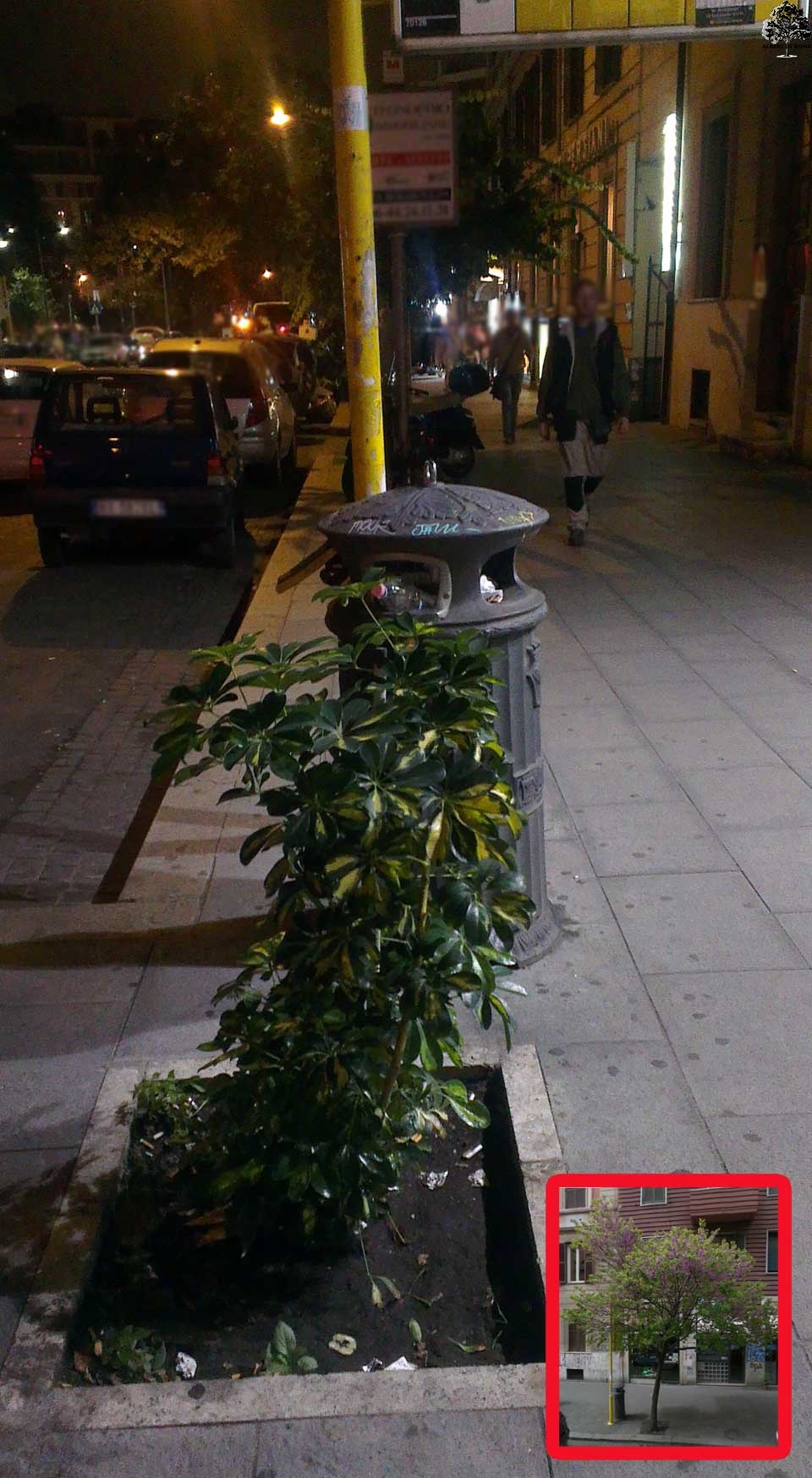 Via Livorno presso il civico 9. Un altro esempio di cittadini dalle verdi iniziative! Al posto dell'albero mancante (vedi riquadro) qualcuno ha collocato una pianta, è un'essenza diversa (Schefflera arboricola) dalle altre presenti lungo la via ma non si può far altro che lodare tanta sensibilità. Data: 7 novembre 2013.