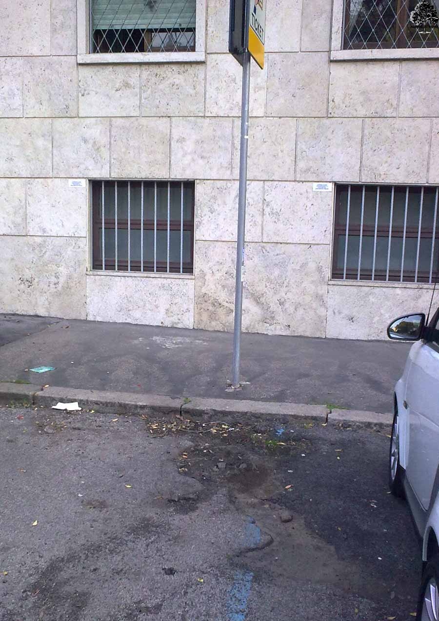 Viale di Villa Grazioli presso il civico 15, esempio di consumo del territorio: quasi non c'è più traccia dell'albero originario, probabilmente un pino come gli altri che ci sono lungo la stessa via. Data: 20 Aprile 2011.