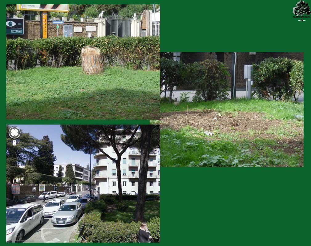 Piazzale Don Giovanni Minzoni, il collage evidenzia la recente rimozione di alberi di pino mentra la foto di GoogleMap (Aprile 2008) mostrava gli alberi nella loro magnificenza. Data: 3 Ottobre 2012.