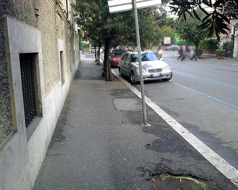Via Giovanni Aldega (b). Esempio di consumo del territorio: in primo piano un aiuola abbandonata e poco più avanti una toppa di asfalto a ricoprire la sede di un albero ormai scomparso. Data: 15 Maggio 2011.