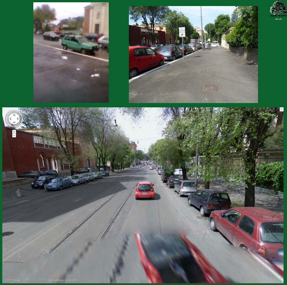 Viale delle Belle Arti, il collage evidenzia gli alberi rimossi rispetto a qualche anno precedente dove una immagine di GoogleMap mostrava un bel viale alberato in particolare di fronte la chiesa di Sant’Eugenio. Data: 25 luglio 2012.