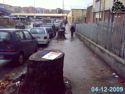 Piazzale della Stazione Tiburtina verso via Masaniello. Data: 4 Dicembre 2009. Google Maps (Street view, Dic. 2010) mostra ancora i platani prima di essere abbattuti.