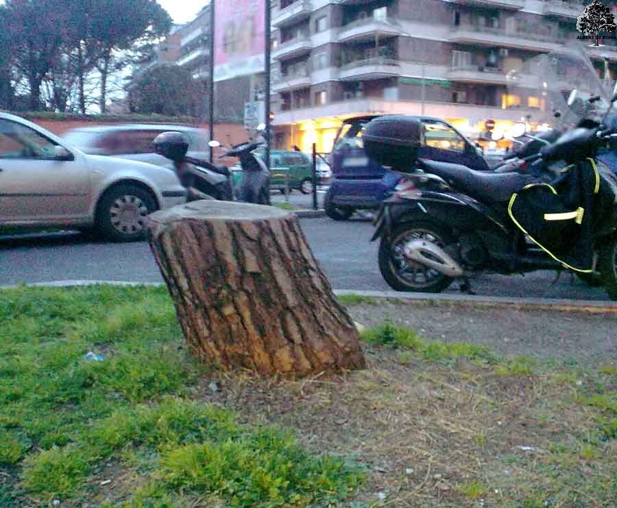 Via Appia Nuova (a) presso il civico 437, tronco di pino nell'aiuola centrale. Data: 25 Marzo 2011.
