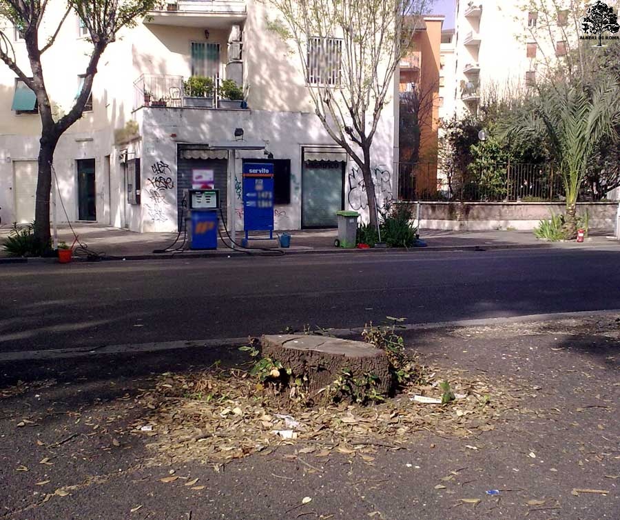 Viale Guglielmo Marconi presso il civico 640. Data: 4 Aprile 2011. Google Map mostra l'albero prima di essere stato rimosso.