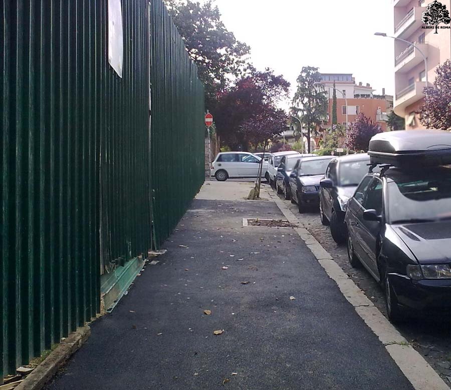 Via Lorenzo Valla (a), due aiuole mancanti lungo un cantiere di fronte il civico 12. Data: 10 Giugno 2011.