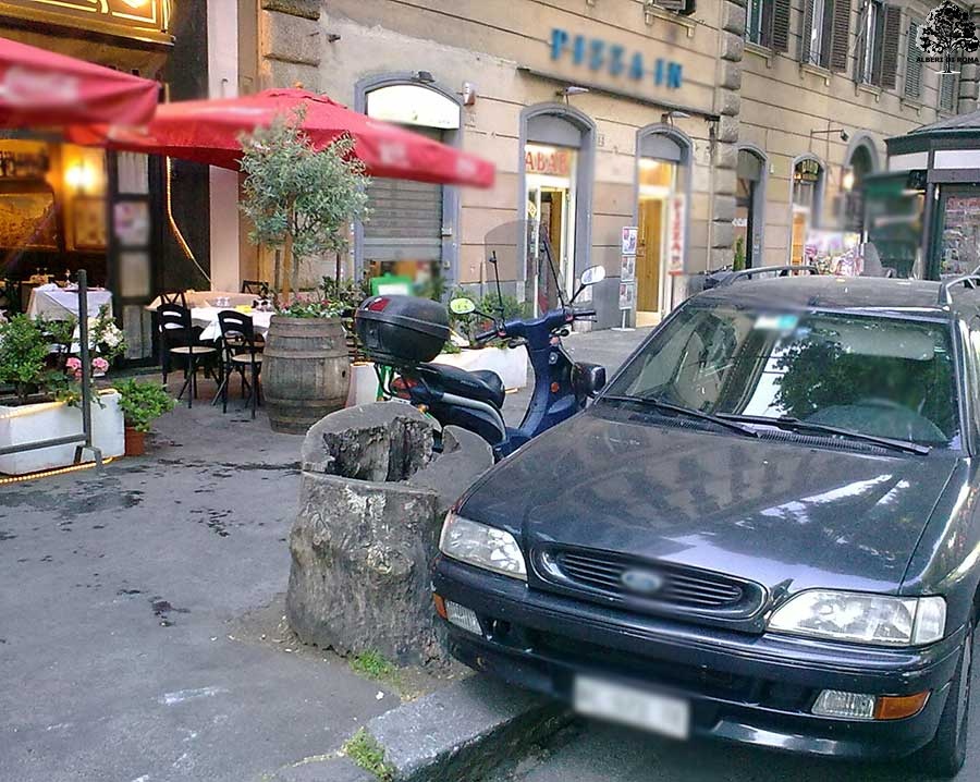 Viale di Trastevere presso il civico 108. Data 5 Maggio 2011. Un ulivo in vaso rimpiazza timidamente il fu maestoso platano, ora mancante.