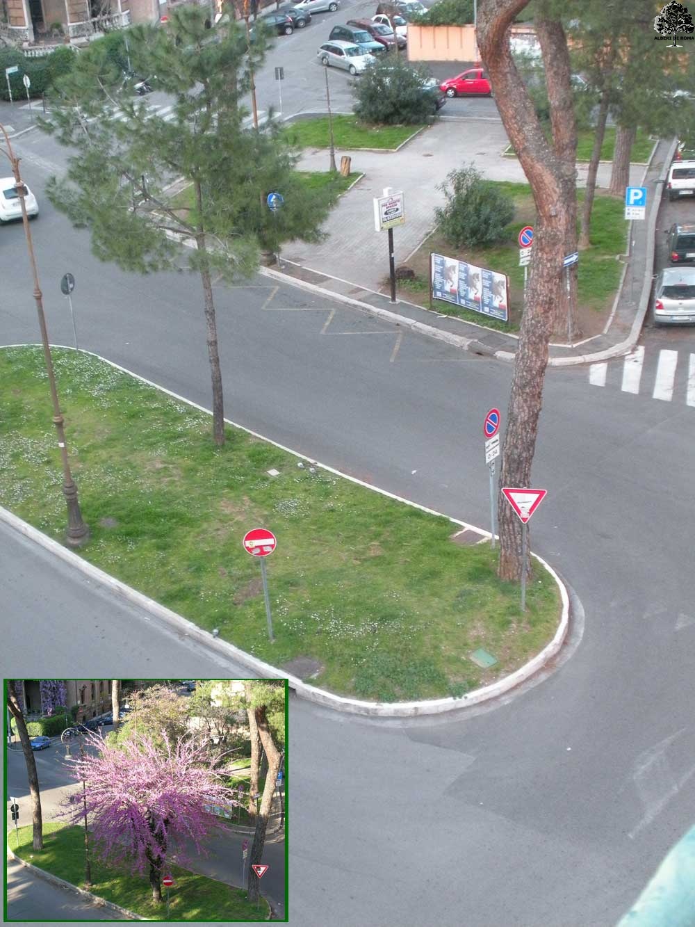 Siliquastro (Cercis siliquastrum) o Albero di Giuda nell'aiuola tra Corso Trieste e piazza Trento. Nel riquadro in basso a sinistra si vede l'albero prima di essere tagliato, in grande la situazione di oggi dopo l'abbattimento del Febbraio 2010 unitamente a due pini alti ed un pino giovane a pochissima distanza l’uno dall’altro. Non si conoscono i motivi dell’abbattimento; non vi erano segni particolari di sofferenza. Un mega cartellone pubblicitario, fu installato di notte, qualche tempo dopo l’abbattimento degli alberi. Data: 11 Marzo 2012.
