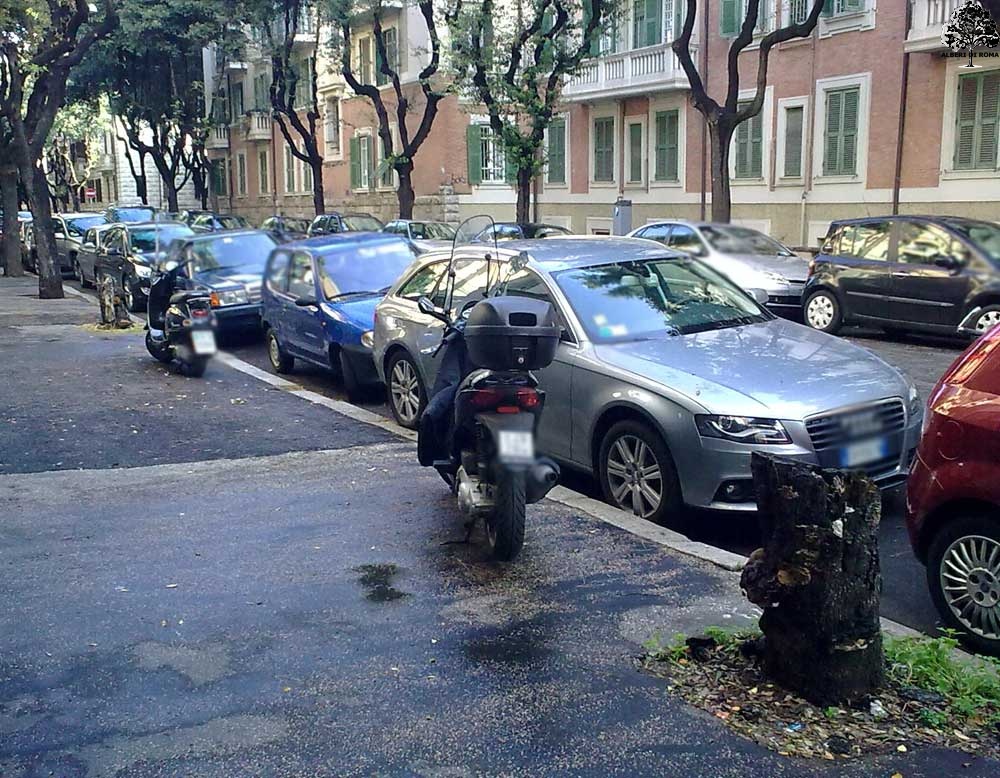 Via Lariana presso il civico 5, due alberi mancanti si alternano ai motorini parcheggiati sul marciapiede. Data: 6 Novembre 2011.