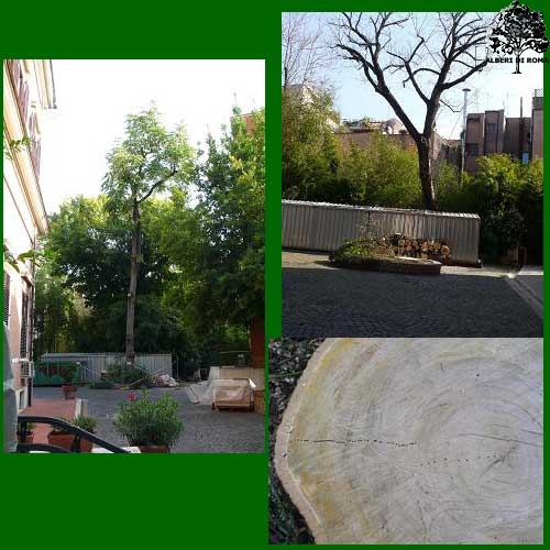 Foto (vedi via Milano A e B), prima e dopo l’abbattimento, di due alberi dopo la nevicata a Roma ma probabilmente dovuto ad altre cause, che si trovavano nell’area verde dell’ex Orto Botanico di Roma del 1873-1883 in via Panisperna, oggi sede dell’Istituto Centrale per il Restauro e la Conservazione del Patrimonio Archivistico e Librario (ICRCPAL) del Mibac in via Milano 76 (Rione I, Monti), ex sede dell’Istituto di Patologia del Libro e prima ancora dell’Istituto di Botanica, qui rimasto dopo il trasferimento dell’Orto Botanico nel 1883 a Villa Corsini in via della Lungara. Le due piante del giardino botanico dell’Istituto, giardino botanico in quanto vi sono ancora diversi esemplari secolari o quasi residuali dai tempi in cui c’era l’Università di Roma al Viminale e notevoli per diversi aspetti (area sottoposta a vincoli ambientali e paesaggistici ope legis), sono o meglio erano: Ailanthus altissima, esemplare femminile intorno ai 70 anni (contati all’incirca 69 anelli annuali alla base del taglio), impiantato negli anni 1938-39 dal prof. Alfonso Gallo, fondatore dell’Istituto di Patologia del Libro, e facente parte di 4 esemplari della stessa specie richiesti all’ENCC per condurre sperimentazioni per la produzione di cellulosa dalle piante ai fini della produzioni di carta per le attività di restauro. Ginkgo biloba, esemplare femminile intorno ai 90 anni (circa 89 anelli), impiantato probabilmente come pianta di studio per le esercitazioni dei laboratori dell’Istituto di Botanica, quando già l’Orto Botanico era stato trasferito al Gianicolo. Data: 13 Marzo 2012.