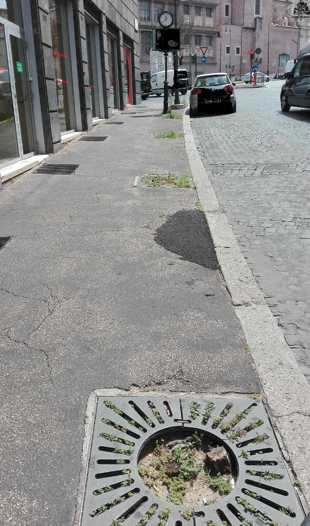 Via Barberini presso il civico 113. Già nel 2011 e nel 2013 avevamo segnalato degli alberi mancanti in una via così centrale, purtroppo l'emorragia continua. Data: 13 giugno 2015.