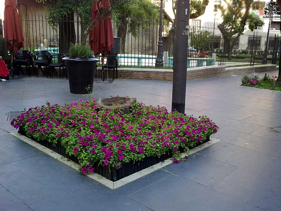 Largo Leopardi, di fronte un famoso panificio. L'aiuola fiorita mimetizza un albero mancante, un pino. Data: 18 Maggio 2011.