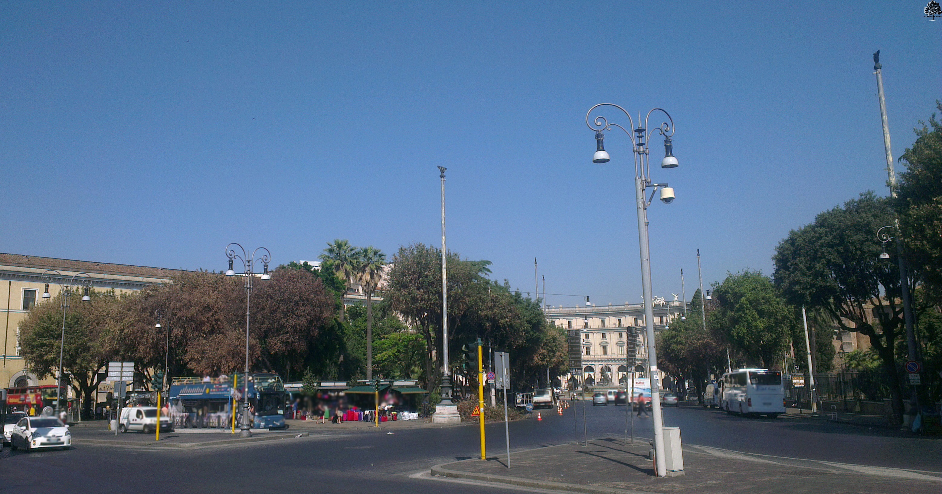 Largo Villa Peretti (già largo Massimiliano Massimo), la foto evidenzia alcuni alberi di leccio con moltissime foglie secche. Sembra che la causa sia un infestazione di afidi. Anche verso l'Esedra, la stazione Termini e in altre zone di Roma i lecci stanno subendo lo stesso attacco. Data: 21 giugno 2013.