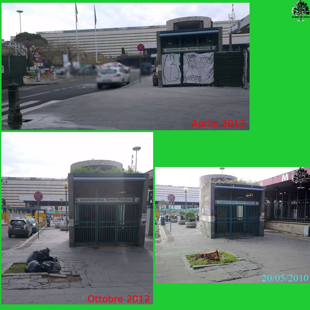 Involuzione di un pino e consumo del territorio: il collage mostra gli ultimi stadi di un pino e della sua aiuola. Tagliato prima del maggio 2010, è rimasta l'aiuola e il ceppo mimetizzato con i rifiuti per oltre due anni (come testimoniato dalla foto del 2012). Infine, durante i lavori di ammodernamento della stazione Termini, l'aiuola è stata pavimentata e un altro albero è scomparso per sempre. Data: 26 Aprile 2013.