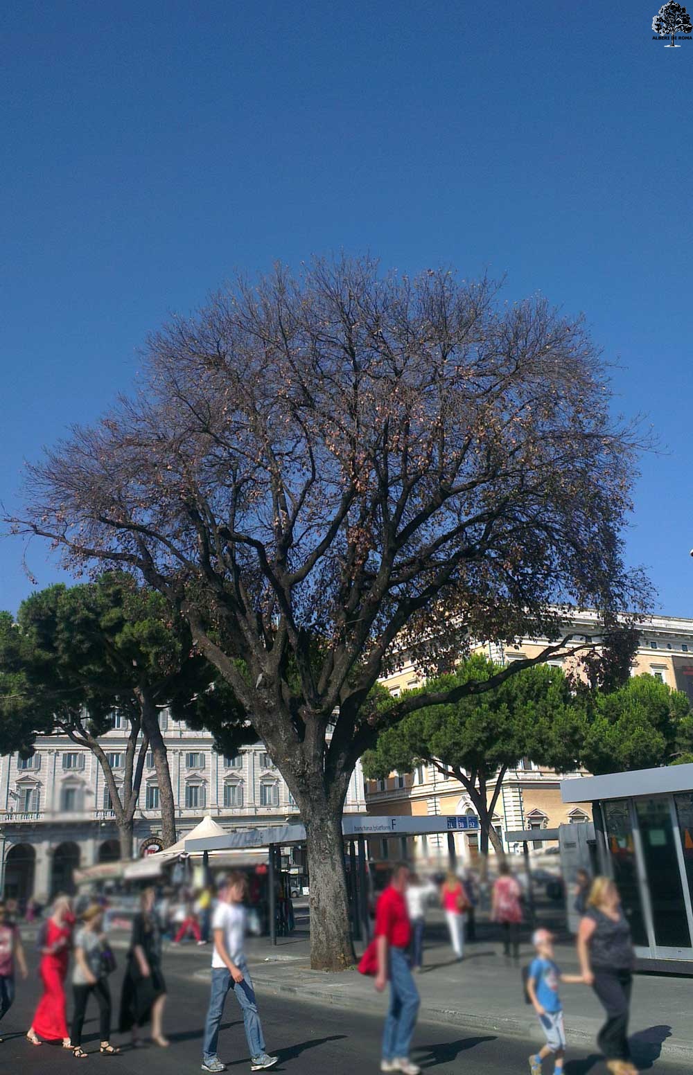 Piazza dei Cinquecento, Stazione Termini. Un leccio secco, al contrario degli altri nella zona, questo non sembra essere stato attaccato dagli afidi ma più probabilmente ha subito un danno a causa dei lavori terminati da poco nello spiazzale antistante la stazione. Data: 2 luglio 2013.