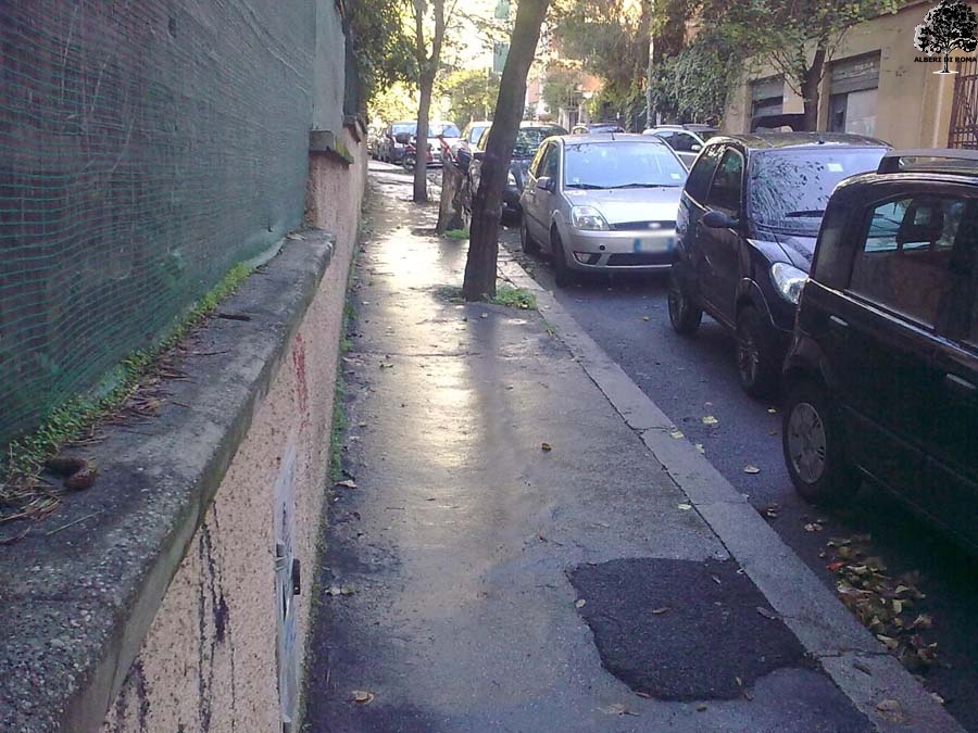 Via Baldassarre Peruzzi. Esempio di consumo del territorio. In primo piano una toppa di asfalto al posto dell'originale aiuola con albero. Sullo sfondo un altro moncone di tronco di albero, forse anche lui sarà rimpiazzato dall'asfalto. Data: 19 Novembre 2010